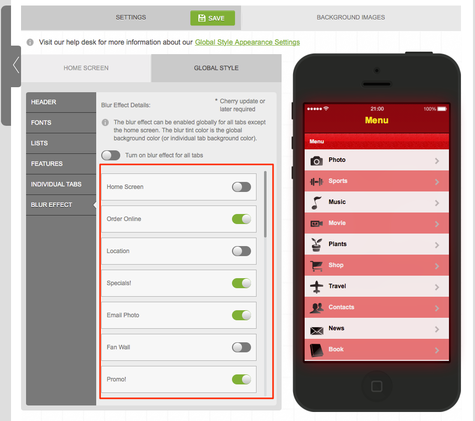 Starting with just one image, you can now toggle the blur effect on globally or on a feature-by-feature basis to complete graphics for your entire app. If you want to spice up some features with a bit of added color, try using images from our included gallery with the added blur effect!